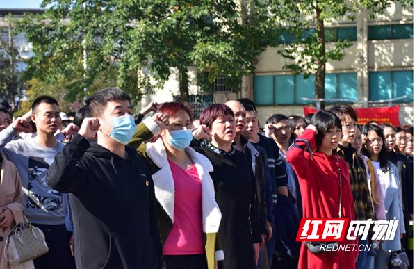 全體學員在蔡和森銅像廣場面對黨旗莊嚴重溫入黨誓詞。